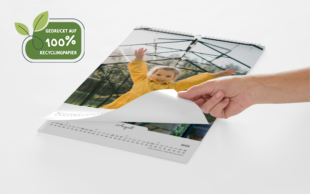 Unser modernes Digitaldruck-Verfahren ermöglicht das De-Inking, was ein sortenreines Recycling ermöglicht. Sollte Ihr Wandkalender entsorgt werden, gehört die Metallringbindung zum Altmetall (Wertstoffhof) und der Holzfuß des Tischkalenders in den Restmüll. Die 13 Kalenderseiten können einfach im Altpapier recycelt werden.
